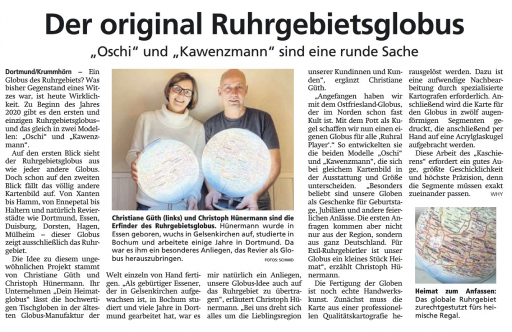 2020 konnten wir die ersten Ruhrgebietsgloben vorstellen. Die vier Modelle erhielten die Namen Kawenzmann, Oschi, Ette und Dat Klümpken ( https://deinheimatglobus.de/ruhrgebietsglobus/. ) Kawenzmann heißt das größte Globusmodell mit einem Kugeldurchmesser von 34 cm – eine echte Wuchtbrumme. Oschi ist der zweite im Bunde mit einem Durchmesser von 30 cm. Oschi ist ebenfalls ein Hingucker und etwas eleganter. Ette ist unser Bestseller, ein Tischglobus mit 26 cm, der an jeden Platz passt. Und der kleinste Globus ist Dat Klümpken.